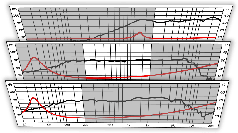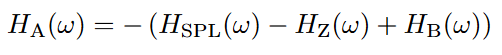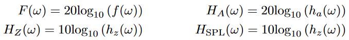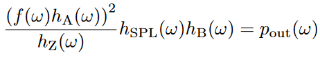 The input signal ‘f’ will be amplified by the filters ‘hA‘. At the speakers’ impedance ‘hZ‘ the signal will be transformed into power. If we then multiply this power output with the efficiency or sound-pressure-level ‘hSPL‘ and the behavior of the box ‘hB‘ we get the total power output density. Rewriting that formula in terms of dB simplifies the equation.