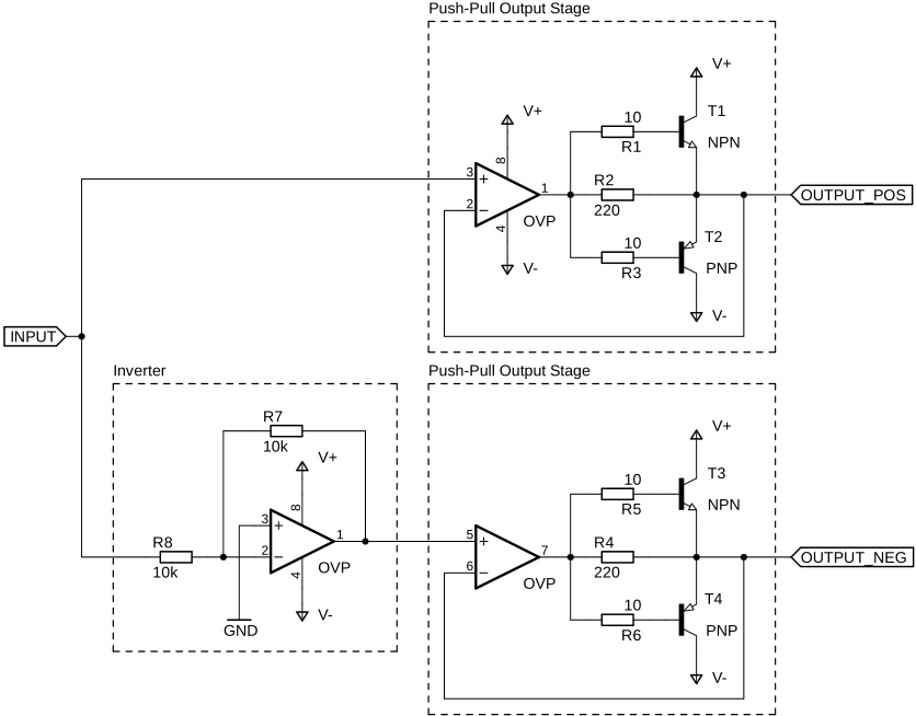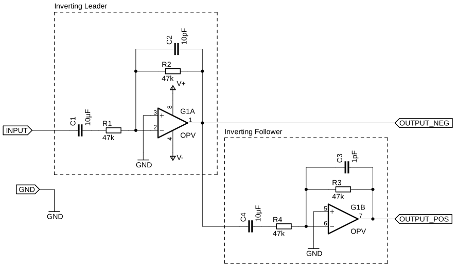 What I thought at that time was, that I can just invert the signal and feed it to a second output stage to create a balanced output. This is displayed in the following schematic: