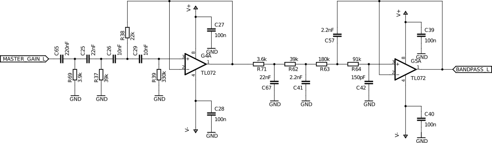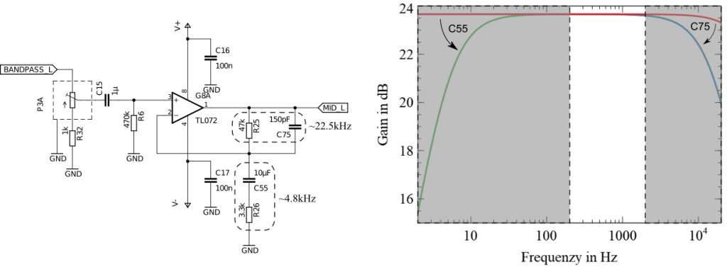 The mid Band does not need a lot of adjustments and the frequency curve can be left at a constant Gain. Nevertheless, this is another good opportunity to reduce potential noise instead of amplifying it. So two capacitors have been added to create a band-pass filter.