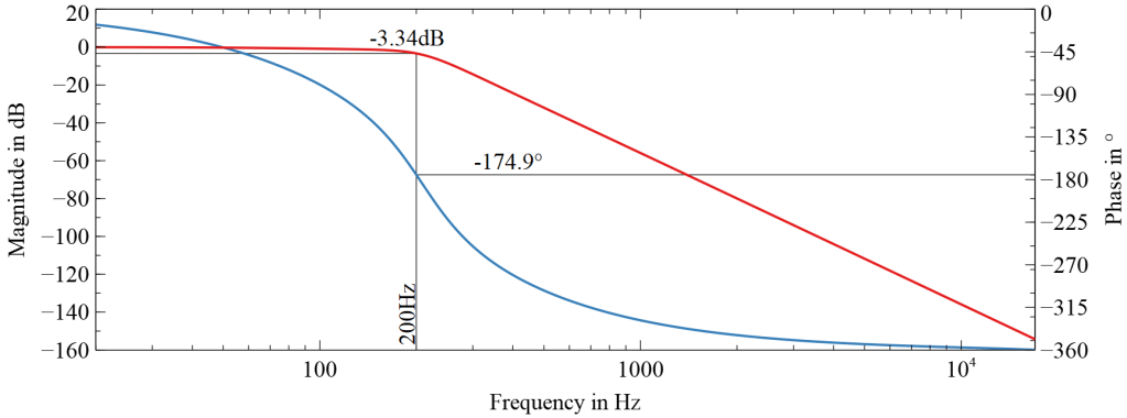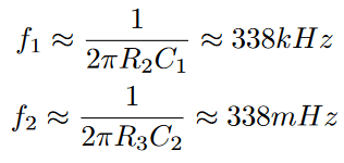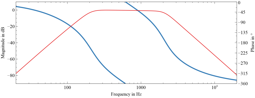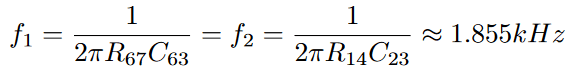 Furthermore, I want to analyze the individual filters. The cutoff frequencies ‘f1‘ and ‘f2‘ of the passive filters can be calculated to: