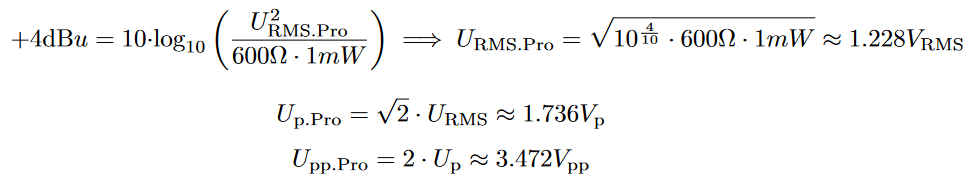 +4dBu is a bit more complicated and has a strong historic bias. 0dBu stands for a signal with a voltage that if it were connected to a 600Ω load would create a power output of 1mW. So the signal strength can be calculated to: