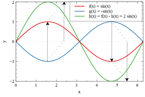 In this chapter, I want to explain how to design an H-Bridge or balanced power amplifier. The advantage of a balanced output compared to a single output is that both outputs can push and pull currents from both power lines – effectively doubling the amplitude of the signal. The following picture shows the effect of a sine wave (red) that has been added with its inverse (blue) which results in a sine that doubled in amplitude.