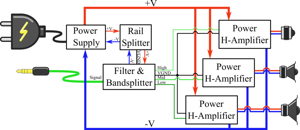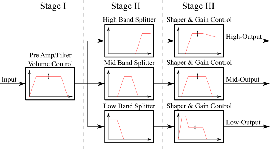 The diagram above shows that in the first stage the input can be variable amplified. Additionally, DC offsets will be blocked and very high-frequency noise suppressed. In the second stage, the signal will be split into the different frequency ranges that each speaker will play. The last stage will add a variable gain for each band and shape the signal to correct the behavior of the speaker and the box.