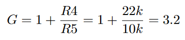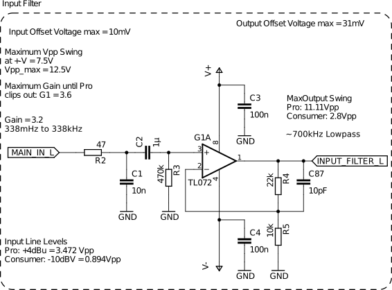 Firstly we want to amplify the signal so that the Pro level does not clip. The Voltage divider of R4 and R5 with 22k and 10kΩ results in a Gain of: