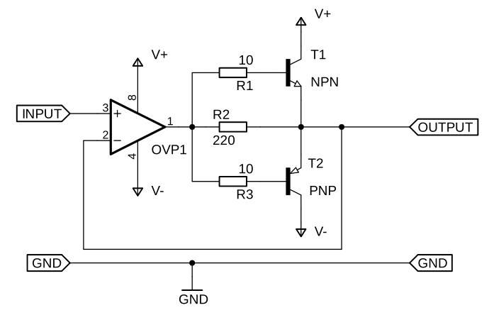 The amplifier oscillates for a relatively long time until it reproduced the signal again. The small spikes at the very beginning and after the big oscillation can be ignored for now, they are just noise from the switching power supply. I tried this with two different Op-Amps, the TL072 which I have also used for the filters, and the NE5532 which supports higher output currents and both created those distortions. It is also interesting to note that the oscillations would only start once the speakers were connected and sometimes the OPVs would have a DC offset and a measurably high voltage difference at their positive and negative input pins. Lesson learned, creating a balanced output using two parallel feedback systems can lead to instability issues. So I needed a fundamentally new design to realize the power amplifier. This leads us directly to version 2.