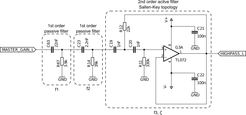 The filters are responsible to amplify the signal, splitting it into different bands for each speaker, and shaping the signal to correct for the speaker frequency response. To accomplish those tasks the filters have been split into three stages as shown below.