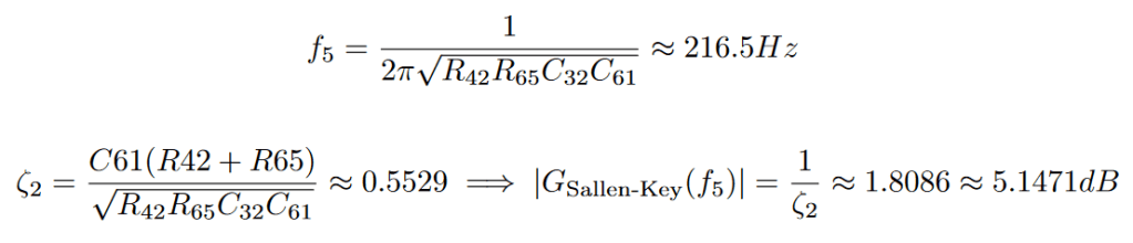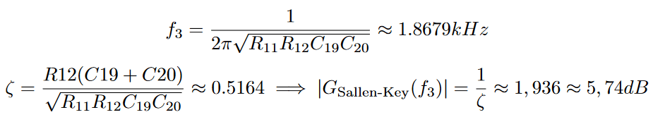 The cutoff frequency ‘f3‘ of the Sallen-Key filter as well as its dampening ‘ζ’ can be calculated to: