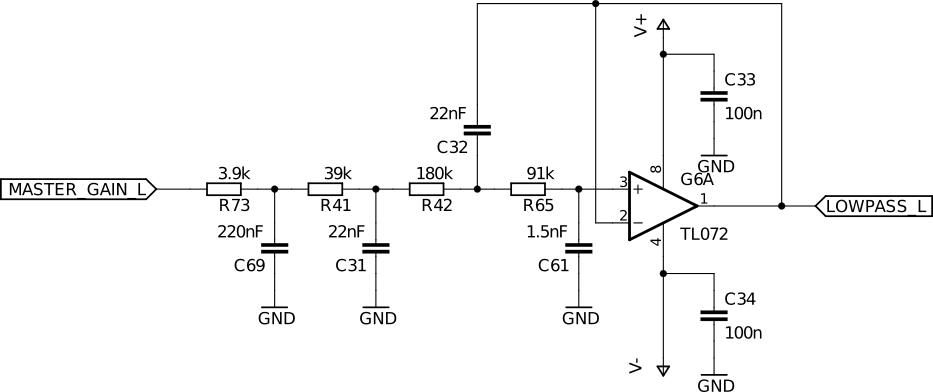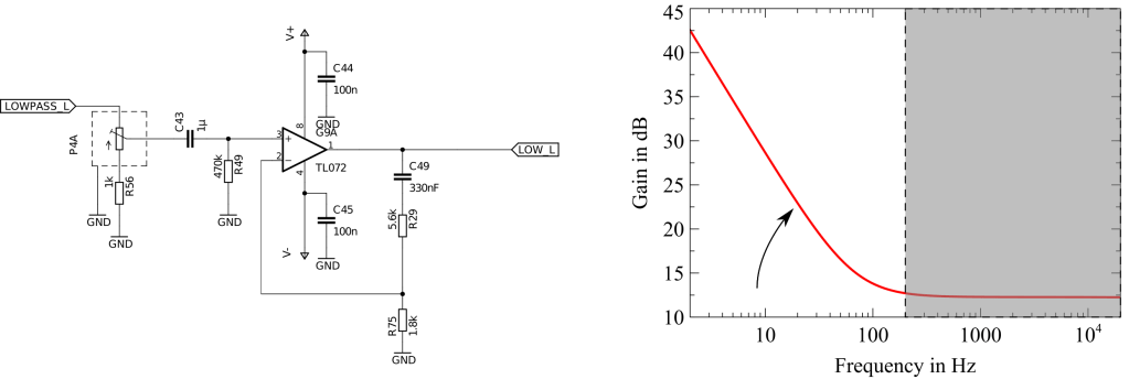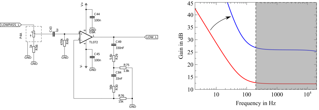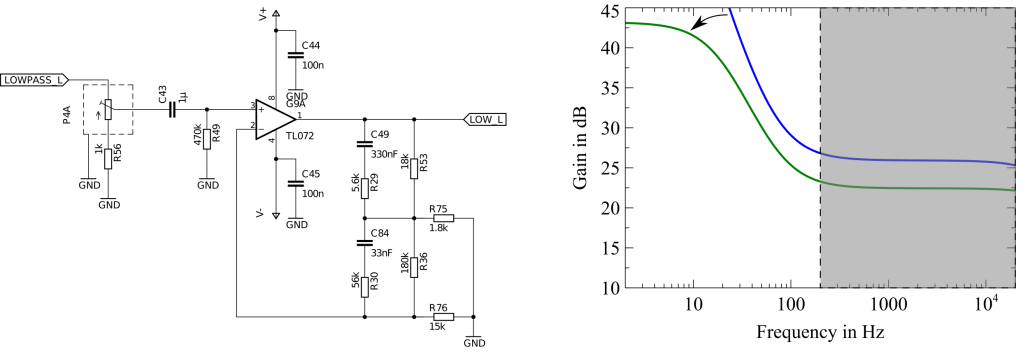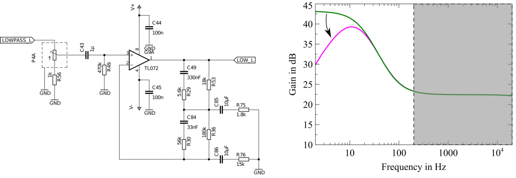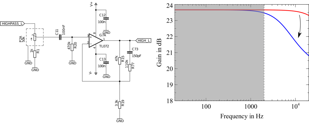 As a final touch, a capacitor C77 can be added that connects right in between the output and the negative feedback of the Op-Amp. This will reduce the gain for high frequencies.