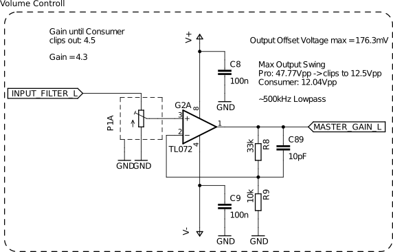 The volume can be controlled by the potentiometer P1A. It is a stereo-logarithmic one so changes feel natural to our ear. If P1A outputs 100% of the input signal, the amplifier will add a gain of 4.3. The pro level would hypothetically be amplified to 47.77Vpp but will clip at the voltage rails. The consumer level will reach a magnitude of 12.04Vpp which is within the tolerated bounds.