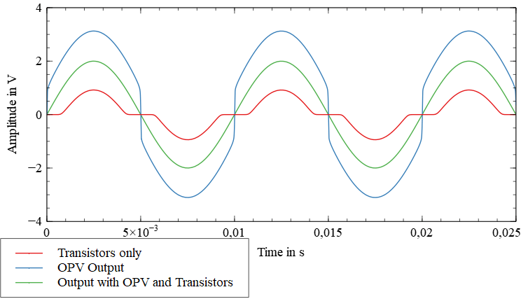 The transistors T1 and T2 in the above output stage are both used as emitter followers. They have the amazing ability to multiply the input current which flows through R1 and R3 into their base. The current multiplication factor is called B, β, but also often named hfe in Datasheets. While amplifying the current the transistors are maintaining the same voltage at their emitter as is presented to their base, minus the np-junction drop voltage (UBE). To overcome the np-junction voltage an OPV has been added which corrects this non-linear behavior. As an example, you can see a 100Hz 1V sine wave at an 8Ω load inputted into just the transistors without the OPV in red. It is clear to see how the sine wave disappears into the time-axis. Now adding the OPV you can see its output in blue and observes how it tries to compensate for the transistors to generate the desired output in green.
