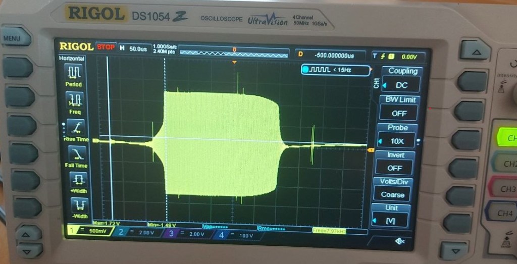 The positive and negative output could then be connected to a load or speaker. This seemed to be a good idea. However, above a certain amplitude when connected to the speaker the amplifier would start to randomly make strange noises that sound similar to a scratched vinyl record. When measuring the output of the amplifier with an oscilloscope (see the picture below) something interesting can be observed.