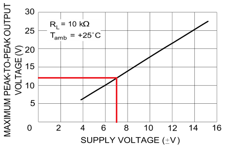 Now we need to figure out how much we can amplify the signal. In my case, I am using a 15V power supply. So when split into two I have a symmetric supply voltage of +-7.5V. A look into the datasheet of the TL072 shows us in Figure 7 that the maximum peak-to-peak output voltage for that supply is at about 12 to maybe 12.5V so that is what we are aiming for.
