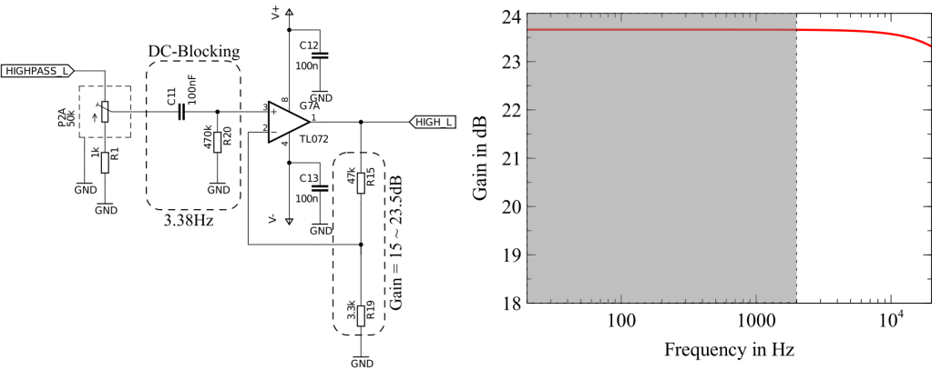 Since this is the high band speaker we want to make sure not to amplify any unnecessary low frequencies. We can prevent the Op-Amp from amplifying low frequencies with a gain of 15 by increasing the impedance between the feedback and ground with another capacitor C79.