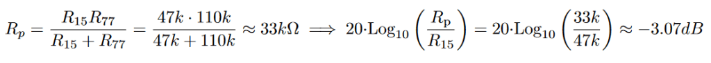In the above diagram with an ideal Op-Amp and very low frequencies, the capacitor C73 has a very high impedance. One can think of it as an open. At very high frequencies C73 has a very small impedance and R15 and R77 are basically in parallel with a total resistance of ‘Rp‘: