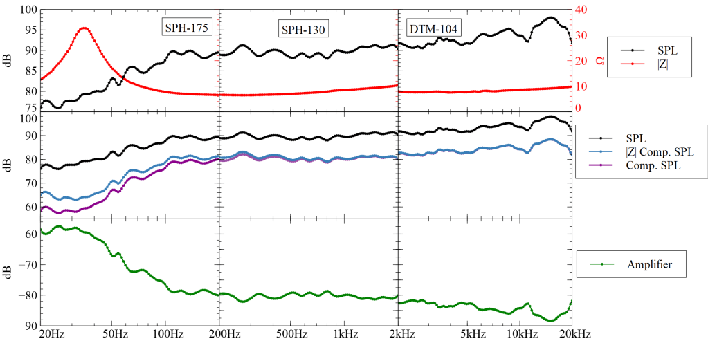 At the top of the graphs, you can see the impedance of the speakers ‘hZ‘ in red and their SPL ‘HSPL‘ in black. In the middle, you can see the impedance corrected output ‘HZCor.SPL‘ in blue. Notice how the impedance peak of the SPH-175 pushes the output down. Simulations of the speaker box showed that it behaves like a high pass with a -3dB frequency at about 70Hz. If we take the speaker box into account and correct the output accordingly we get ‘HCor.SPL‘ in violet. The desired shape of the amplifier ‘HA’ is then the inverse of the corrected speaker output and can be seen in green.