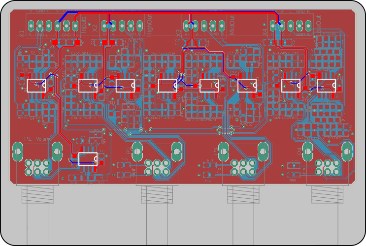 The shapers are responsible to correct the frequency response of the system and create a flat system response. A calculated frequency curve for each speaker band has already been shown in figure (3). In the following schematics, we will approximate those with iterative filter designs. Furthermore, potentiometers have been added to control the gain of each band. Additionally, At the output stage, the signal will be amplified one last time before it goes into the power amplifiers.