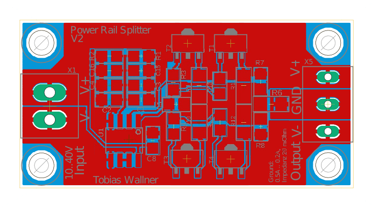 The power rail splitter, as seen in figure 27-a, is just a push-pull output stage that tries to keep the output (the virtual ground) exactly in the middle of the two input lines. Resistors R9, R10, R11, and R12 have been placed to help the transistors dissipate power. Two transistor pairs are used, one would be enough but the calculated dissipated power comes very close to Ptot in the datasheet. So just to make sure that the SMD Transistors are not going to blow up during normal operations two transistor pairs have been placed in parallel.