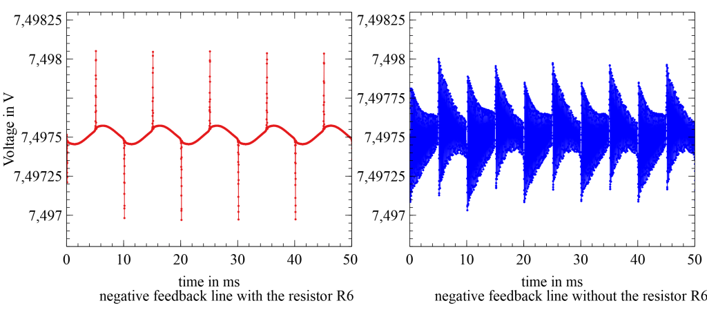 Since the output is very capacitive the resistor R6 has been added after the Feedback line to stabilize the OpAmp. Otherwise, it may start to oscillate at high frequencies which may drive the push-pull transistors noticeably hot. One would think that the small resistor R6 of 20mΩ does not do much, but the following comparison shows how important it is. The following voltages have been acquired between the negative supply and the negative feedback of the OpAmp with and without the resistor R6 while the speakers play a loud 100Hz tone at full swing.