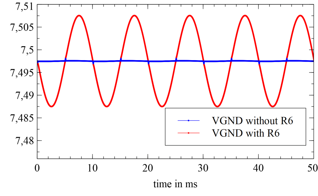 But as always nothing comes without a drawback. While the added resistor R6 can decrease high-frequency noise that would have been introduced into the, we lose a lot of ground precision as seen in the following overlay between the virtual ground outputs with and without the output resistor.