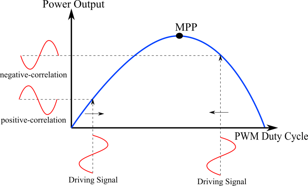 As seen in Figure 5, if we are left of the MPP the driving-signal (modulated input sine wave) is in phase with the power output and has a positive correlation. However, if we are right of the MPP the power output will yield a 180° phase shifted sine and thus has a negative correlation with the driving-signal. So the correlation can be used to estimate the gradient.